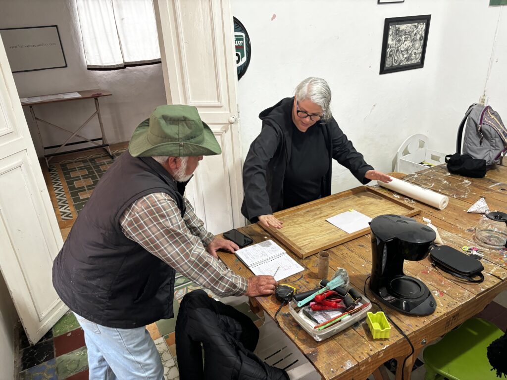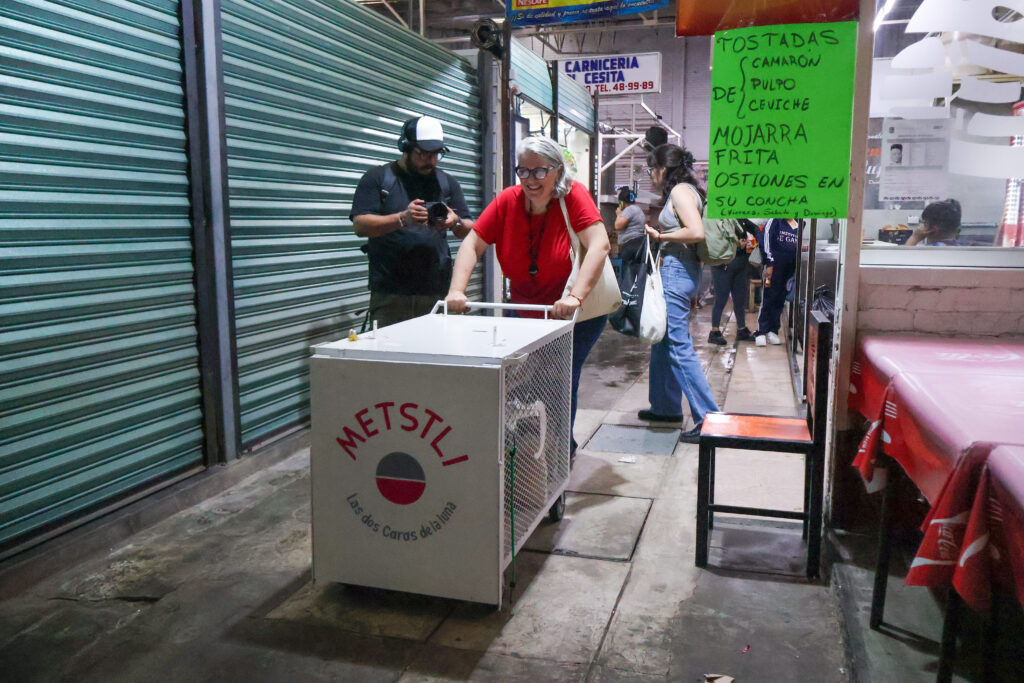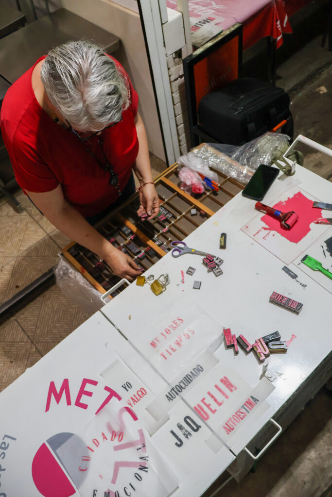 Hace su gran aparición Metstli, un dispositivo artístico-pedagógico (DAP) que nos permite generar el encuentro para, en un primer momento, realizar un mapeo desde la oralidad a través de un artefacto/ artilugio que contiene preguntas disparadoras para la conversa. En un segundo momento nos da la posibilidad de crear el espacio para brindar un gesto de cuidado, mientras del otro lado se realizan grafismos, impresiones de palabras que se transforman en imágenes y construyen varios remanentes poéticos.